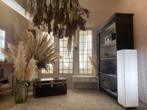 アンティーク家具やスワッグで彩られたおしゃれなスタジオ。